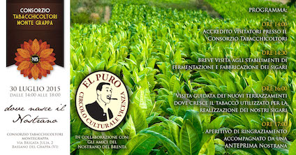 Giovedì 30 Luglio 2015 Porte aperte al Consorzio Tabacchicoltori Montegrappa; la culla del Sigaro Nostrano del Brenta apre agli appassionati di questo manufatto unico nel suo genere, per un esclusiva visita alle manifatture e ai terrazzamenti dove si coltiva l’Avannone del Veneto. Giovedì 30 Luglio 2015 dalle ore 14:00 alle ore 18:00 Presso Consorzio Tabacchicoltori Montegrappa, via Brigata…