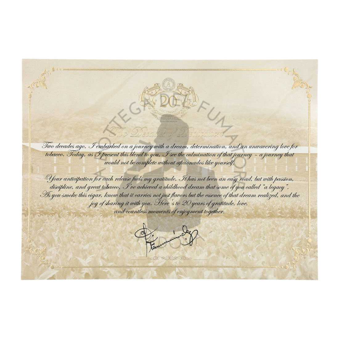 Il marchio deve il suo successo alla linea San Lotano presentata nel 2010, e oggi dopo 14 anni da quel giorno, A.J. rende omaggio ai suddetti giorni del garage, con il sigaro AJ Fernandez 20Th Anniversary. Questi sigari, sono stati realizzati in appena 7.500 scatole da 20 unità, utilizzano i tabacchi più pregiati di Fernández, provenienti dalle sue piantagioni in Nicaragua.