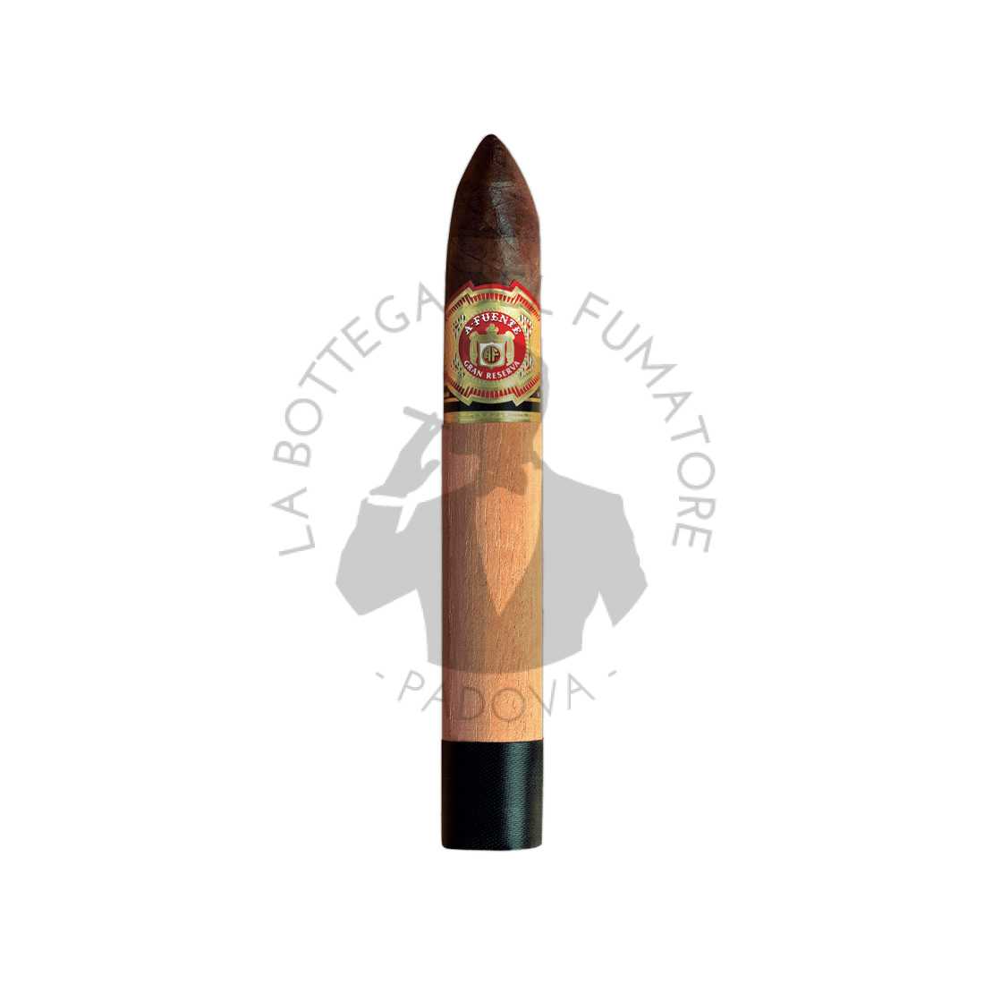 Il Cuban Belicoso della linea Chateau Fuente è un sigaro che richiama le forme classiche cubane, con la sua vitola belicoso da 146 mm x 51″, elegante e leggermente affusolata in punta. Viene prodotto con una miscela di tabacchi dominicani invecchiati e rifinito con una capa Sun Grown. In passato veniva distributa anche una variante denominata Natural, con capa Connecticut Shade. La sua forma conica non è solo estetica: favorisce una fumata più concentrata e graduale, valorizzando al massimo l’evoluzione del blend. Il Cuban Belicoso è presentato nel consueto stile Fuente, con fascia di cedro e nastro colorato. È un sigaro che unisce tradizione e raffinatezza, ideale per chi cerca un’esperienza ricca ma contenuta nel tempo.