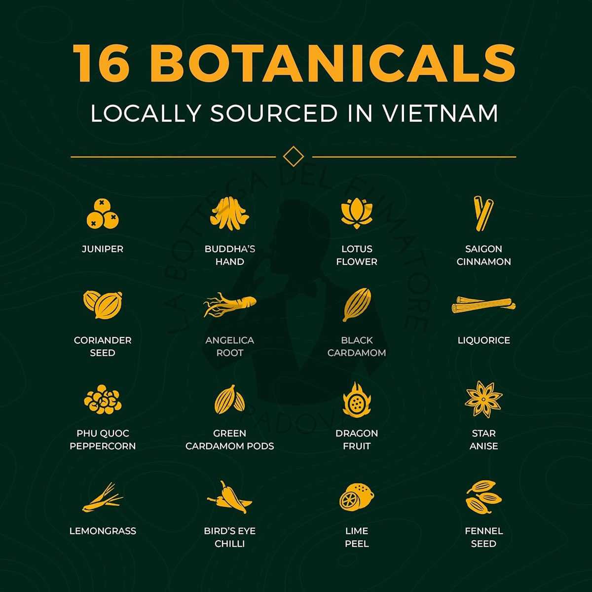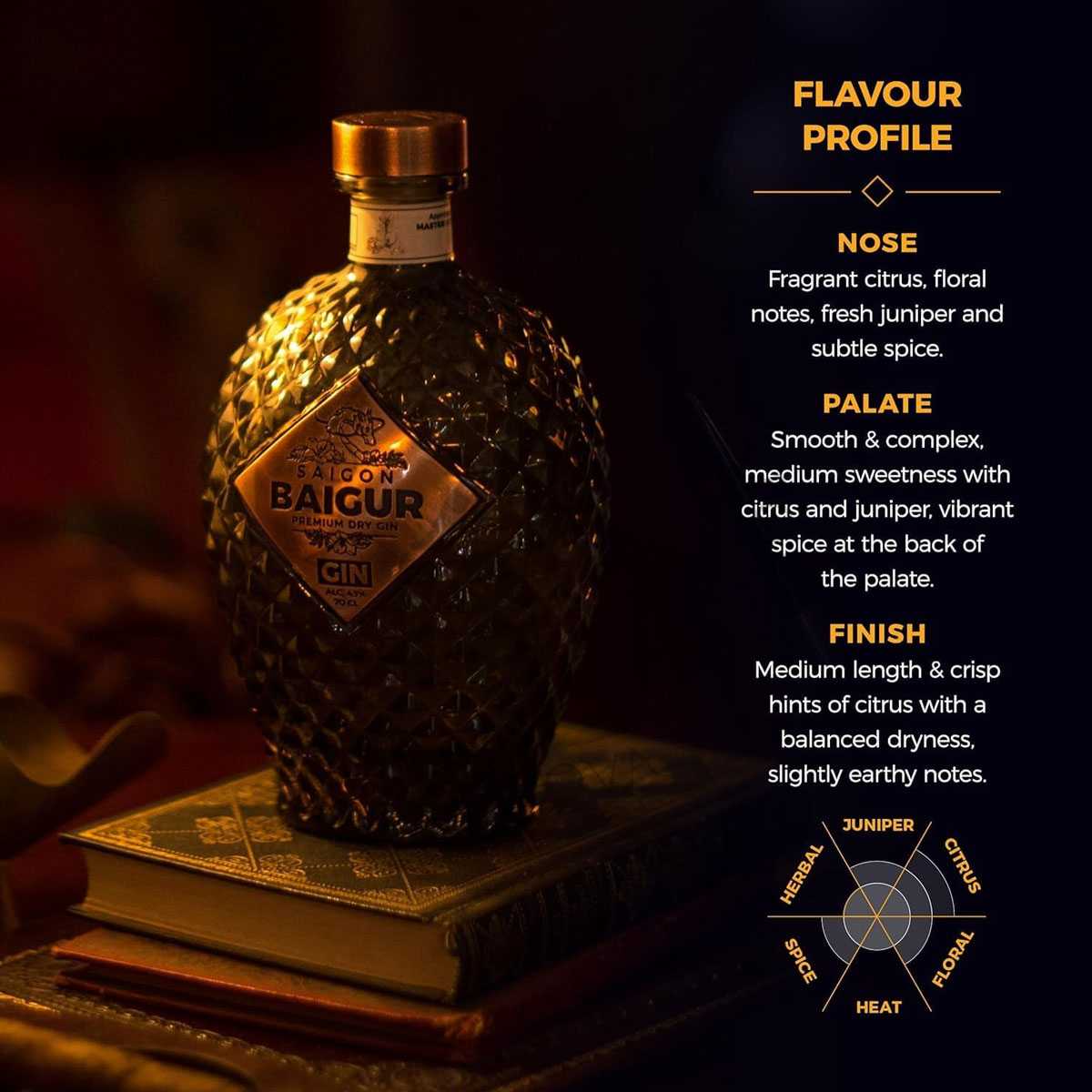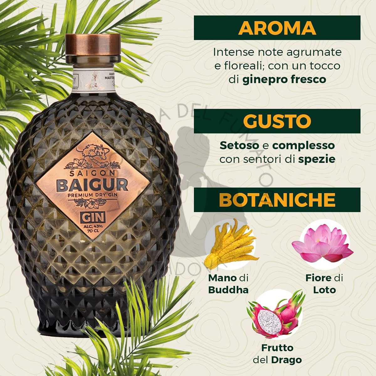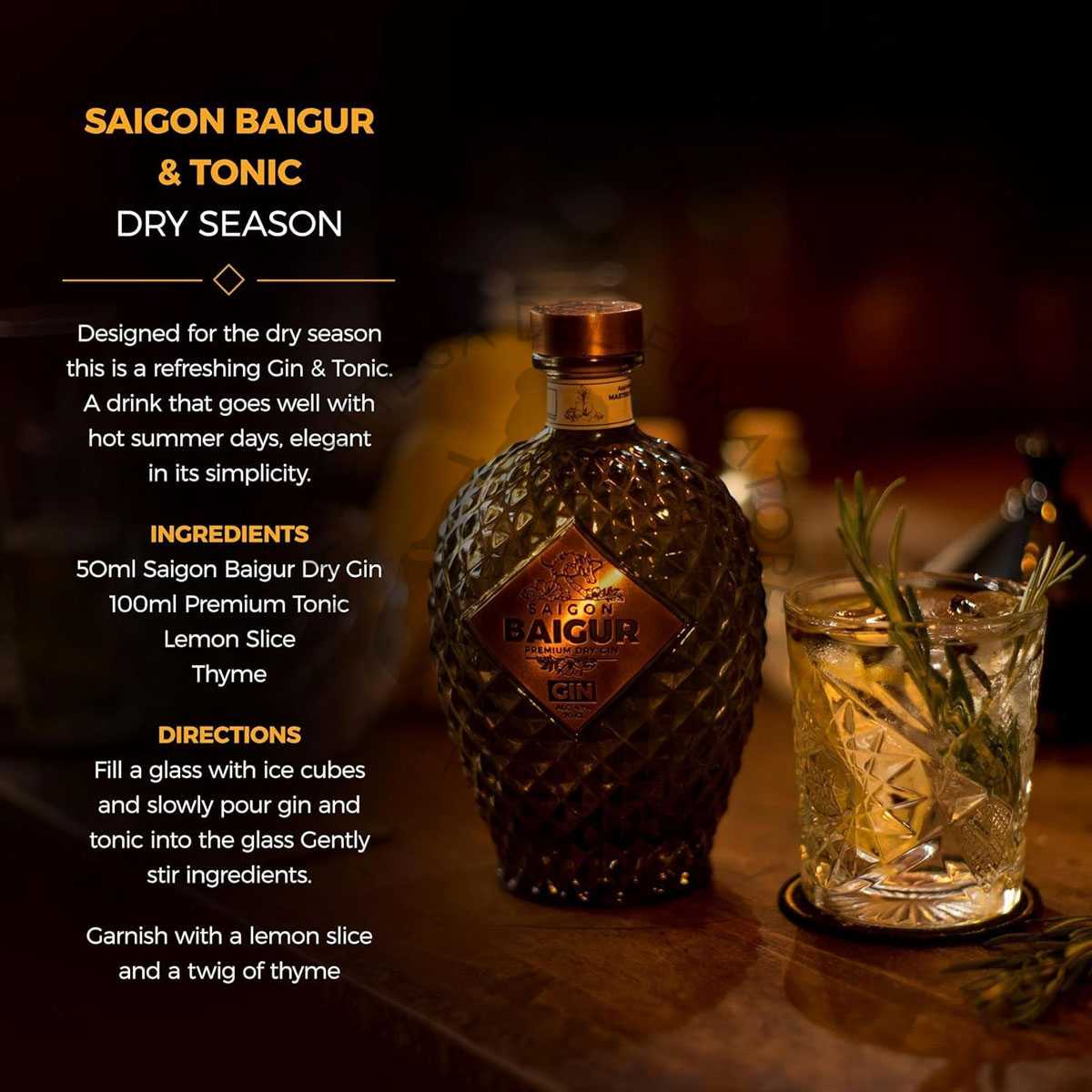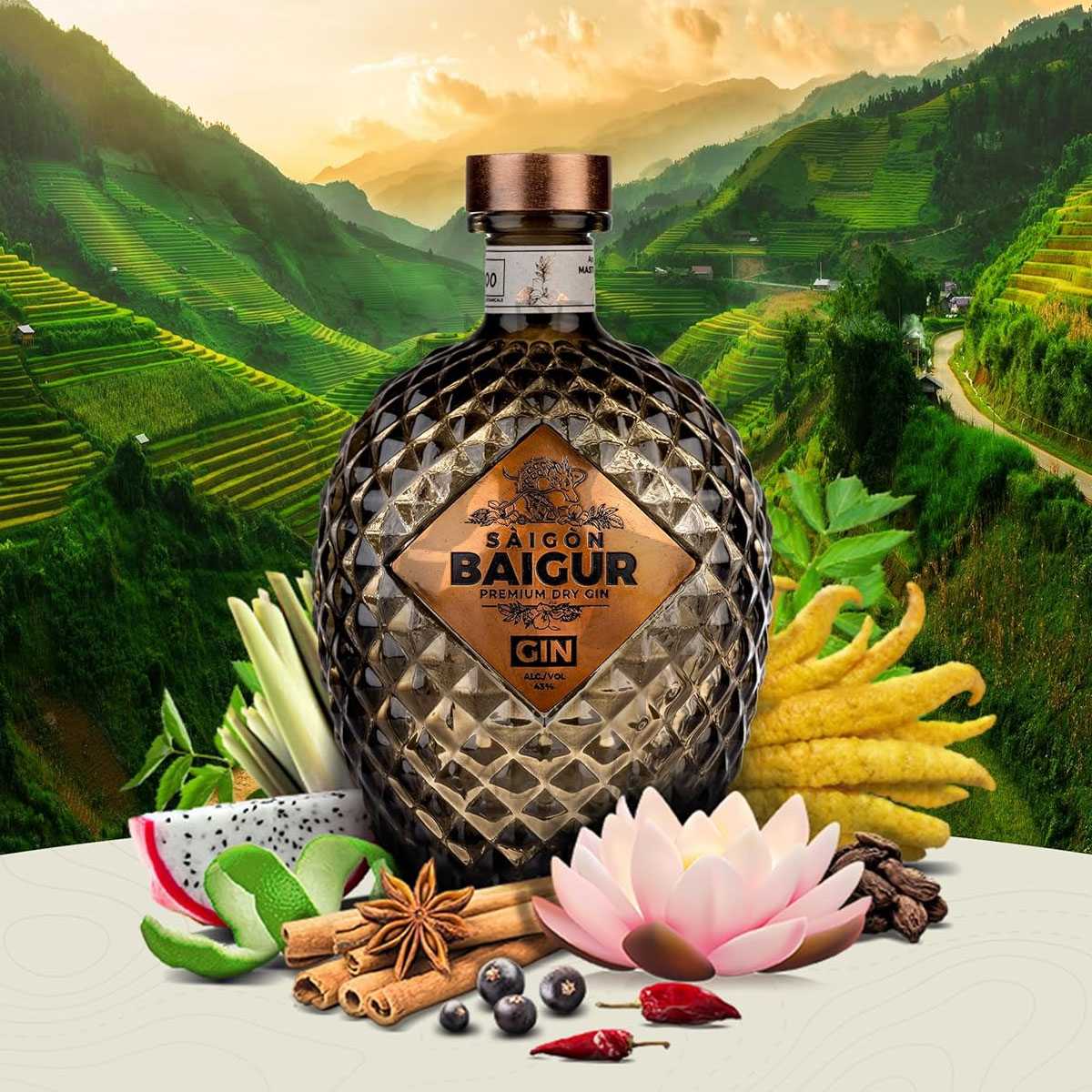 Il Gin Saigon Baigur Dry è il risultato dell’unione di 12 botaniche locali distintive (Bacche di Ginepro. Mano di Buddha, Fiori di Loto, Cannella, Semi di Coriandolo, Radice di Angelica. Noce Moscata, Liquirizia, Pepe Phu Quoc, Cardamomo, Thanh Long, Dai Hui, Citronella, Peperoncino, Scorza di Limone). Combinate con 4 ingredienti classici del gin. È proprio da questa combinazione unica che deriva il gusto fresco e vibrante del gin, ispirato alla città di origine.