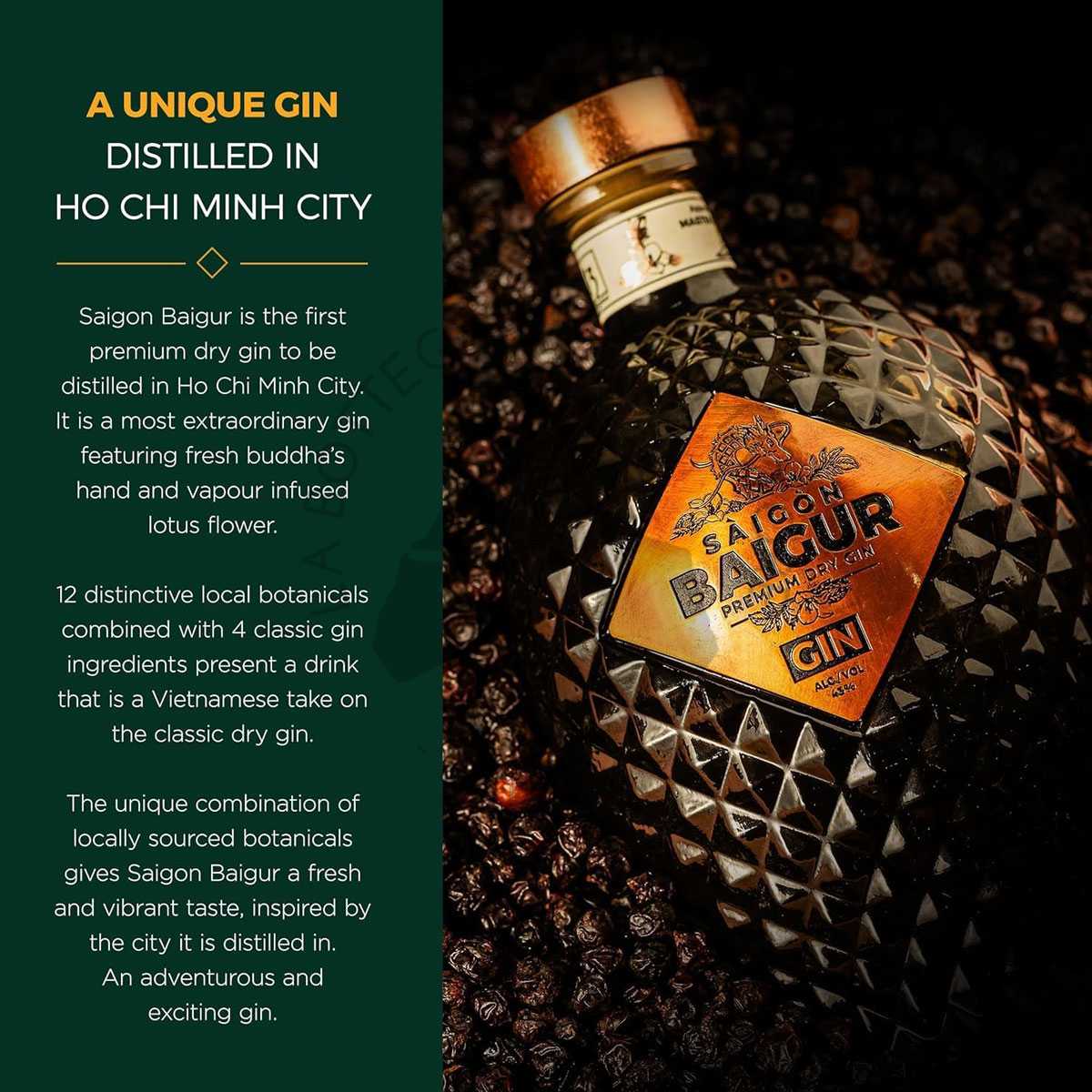Saigon Baigur è il primo Premium Dry Gin artigianale distillato a mano a Ho Chi Minh in tradizionali alambicchi di rame, utilizzando solo gli ingredienti migliori, tipici del Paese Asiatico. Come Mano di Buddha, Frutto del Drago, Fiori di Loto, Cardamomo, Liquirizia, combinate con 4 ingredienti classici del gin,.