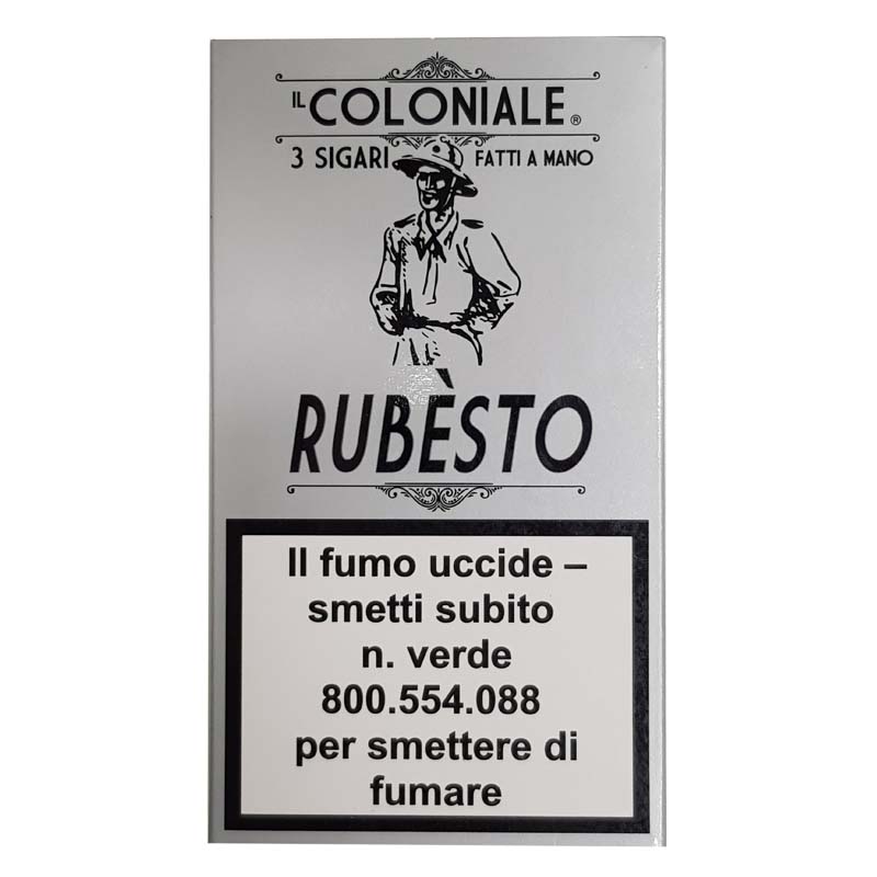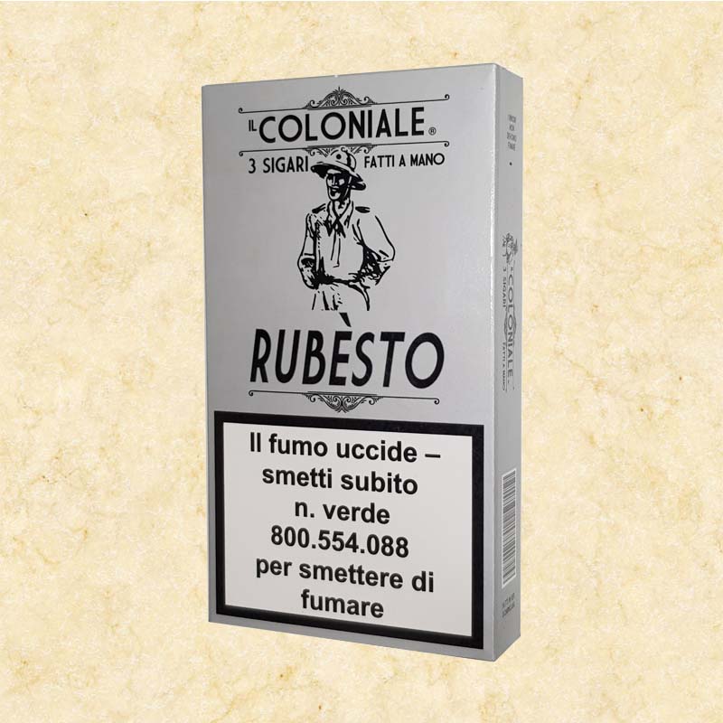 Il Coloniale Rubesto è un sigaro long-filler di fattura imponente con i suoi 12 cm di lunghezza ed un cepo 50. Caratterizzato da un cuore costituito al 60% da selezionato Kentucky americano ed ingentilito dalla presenza dei migliori tabacchi caraibici, il tutto impreziosito da una fascia San Andres extra.