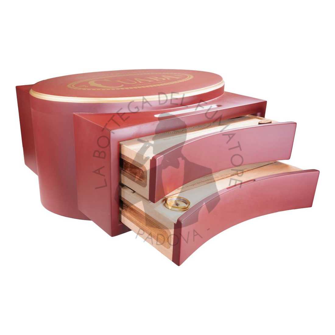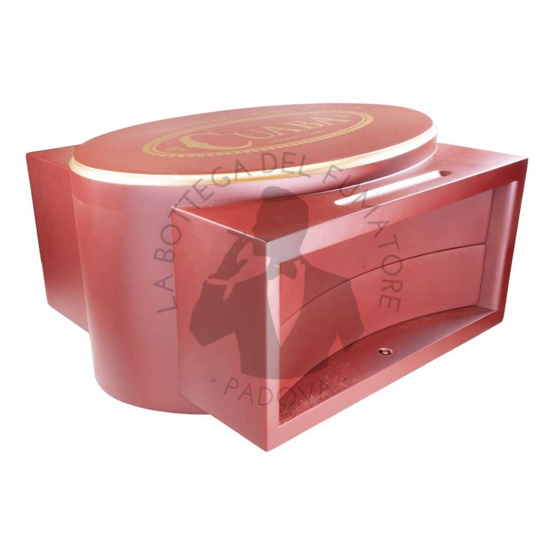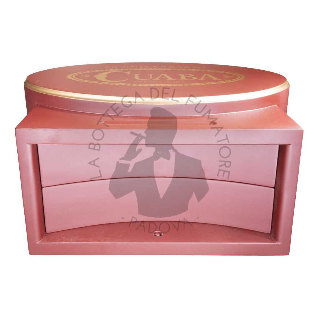Interamente realizzato a mano con pregiate essenze di legno cubano, il cofanetto presenta cassetti in stile cabinet e finiture dorate. Sul coperchio di un cassetto è incisa la citazione di Cristoforo Colombo: “Iban siempre los hombres con un tizón en las manos”. Una frase contenuta nel diario di Colombo, da cui fu ricavato anche il nome del brand “Cuaba”, primo europeo a usare questo termine, per descrivere la torcia usata dai Tainos per accendere i loro primordiali sigari.