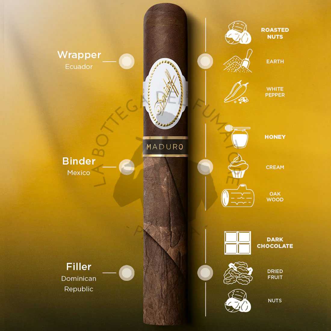 Davidoff Maduro è presentato in tre formati popolari: i più grandi Toro e Robusto e il più piccolo Short Corona per quando il tempo scarseggia. Ogni formato offre un viaggio di gusto leggermente diverso e offre agli appassionati la scelta perfetta per ogni occasione. Ciò che hanno tutti in comune è il caratteristico aroma sofisticato, dolce e cremoso di Maduro. Questo aroma è in gran parte dovuto alla speciale fascia che Davidoff utilizza per questo sigaro.
