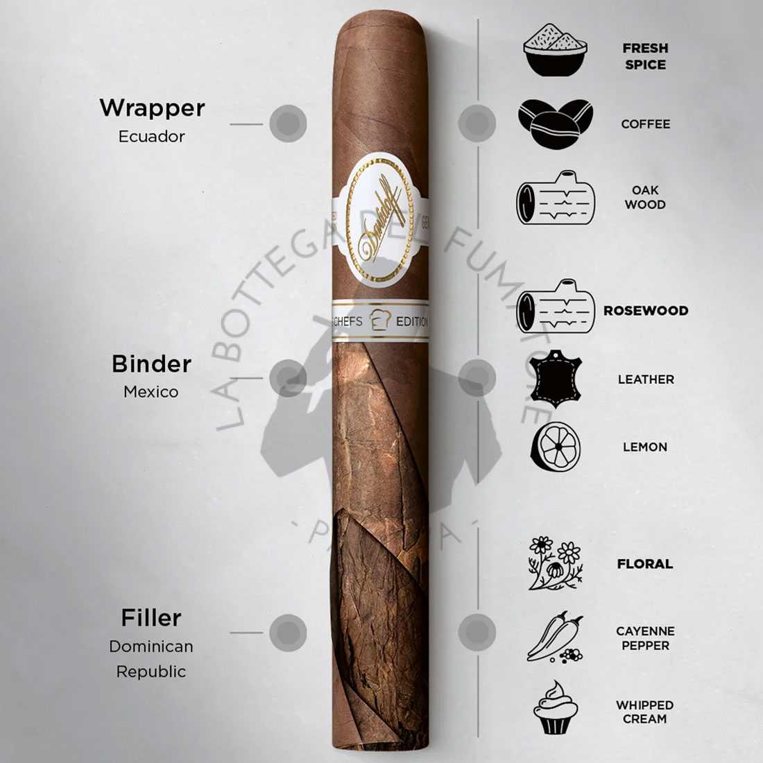 Il blend è il frutto di una selezione meticolosa di tabacchi, provenienti da diverse origini, con invecchiamenti che testimoniano la filosofia Davidoff nel ricercare complessità ed equilibrio. La capa (wrapper) proviene dall’Ecuador, un tabacco elegante e setoso che funge da cornice aromatica. Il capote (binder) è invece di origine messicana, aggiunge struttura e profondità alla miscela.