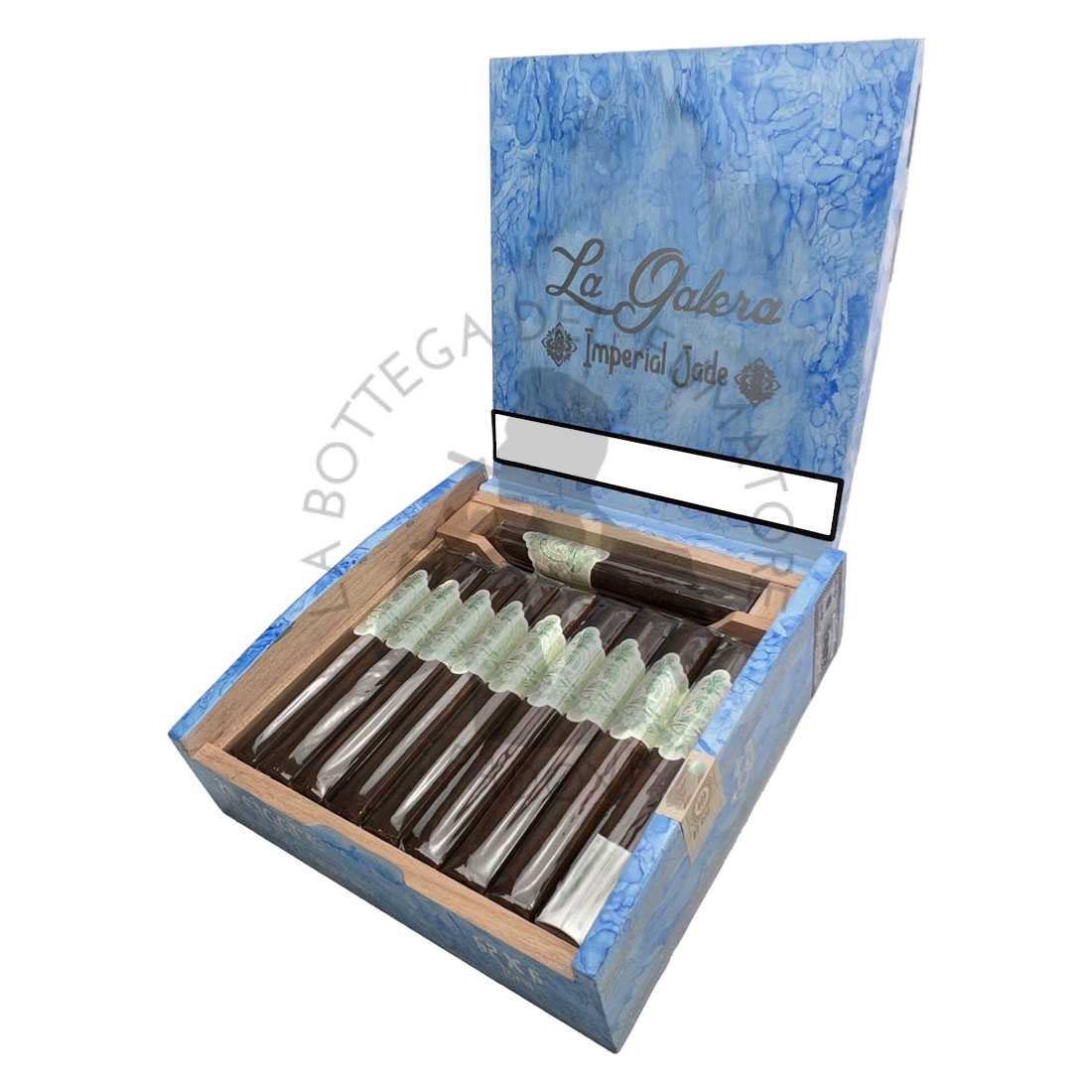 La Galera Imperial Jade Toro (152mm × 52″) è probabilmente il più bilanciato dell’intera linea Imperial Jade, offrendo un perfetto equilibrio tra durata, evoluzione aromatica e pienezza di corpo. Realizzato con un Cameroon wrapper africano di qualità eccellente, un binder Criollo dominicano e un filler composto da Piloto Cubano e Criollo ’98, il Toro viene confezionato in scatole da 20 sigari. È pensato per chi desidera una fumata più lunga e progressiva, con una costruzione impeccabile e un ritmo regolare. È il formato ideale per cogliere tutta la complessità e la dolcezza speziata che definisce questa linea firmata La Galera.