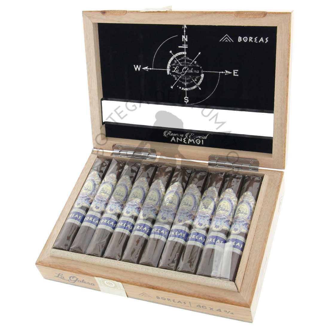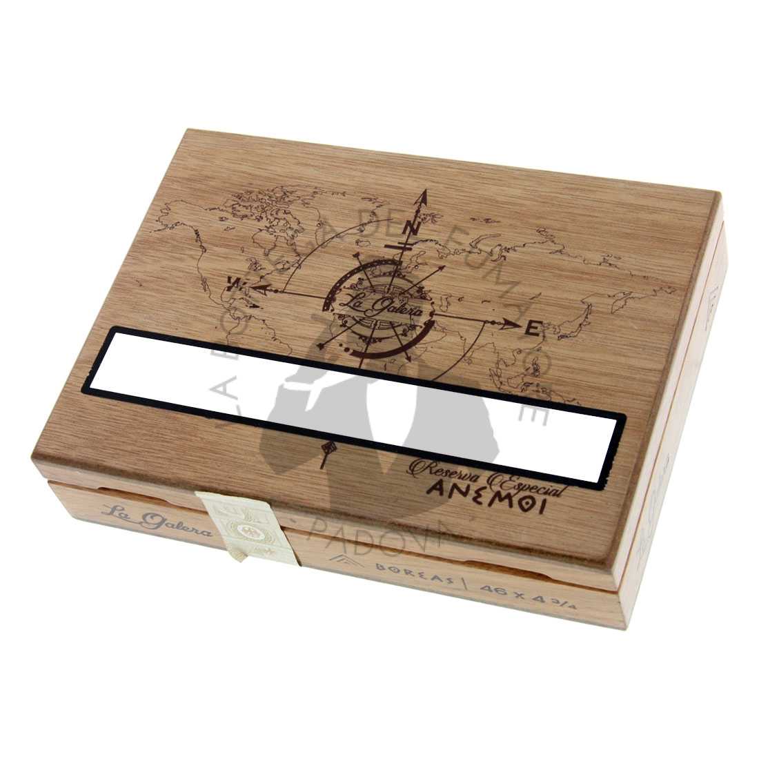 Il La Galera Reserva Especial Anemoi Boreas (Short Corona) è il più compatto tra i sigari della linea, con il suo formato Corona da 120mm di lunghezza e un ring gauge di 46″. Prende il nome dal vento del nord nella mitologia greca, simbolo di forza e rigore: caratteristiche ben riflesse nella sua personalità aromatica. Nonostante le dimensioni contenute, il Boreas concentra intensità e sfumature con sorprendente efficacia. Confezionato in box da 20 unità, si presenta elegante, ben costruito, avvolto nel tipico Connecticut Broadleaf Maduro, scuro e leggermente oleoso. È il formato perfetto per chi cerca una fumata breve ma profonda, senza rinunciare alla complessità.