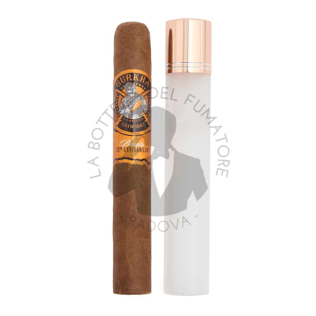Il Gurkha Beauty 25th Anniversary, è una bellissima oltre che esclusiva, edizione limitata, presentata in maniera molto elaborata. Ogni sigaro è ornato da una anilla olografica oversize, ed inserito in un tubo in vetro smerigliato, con un tappo color oro rosa. Il cofanetto in legno di ciliegio finemente lavorato, contiene 25 sigari in tubo. Venticinque anni fa, il sigaro Beauty originale faceva girare la testa con il suo gusto setoso e morbido di panna, cedro e noci tostate. La nuova variante riesce a scavare ancora più a fondo nel lusso.