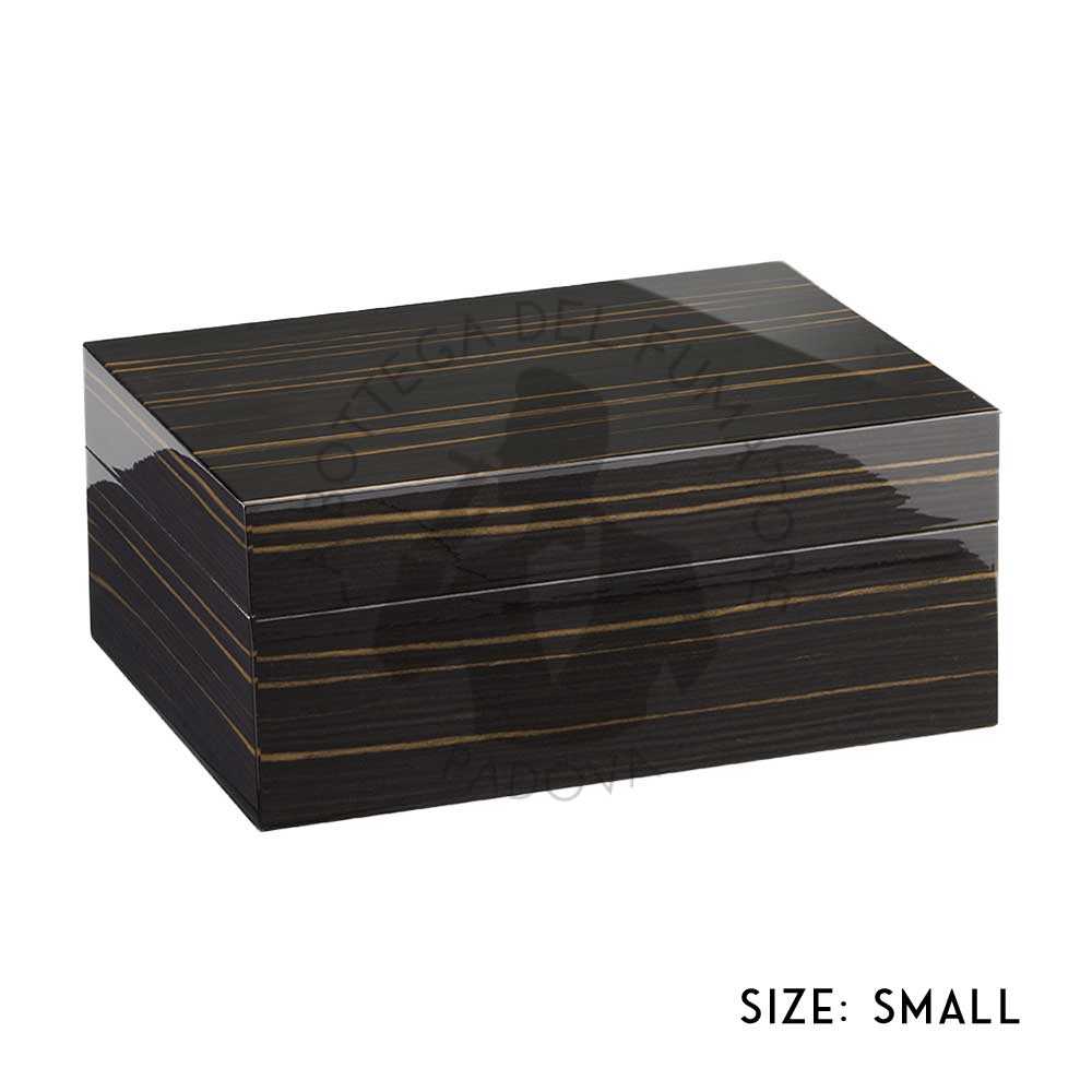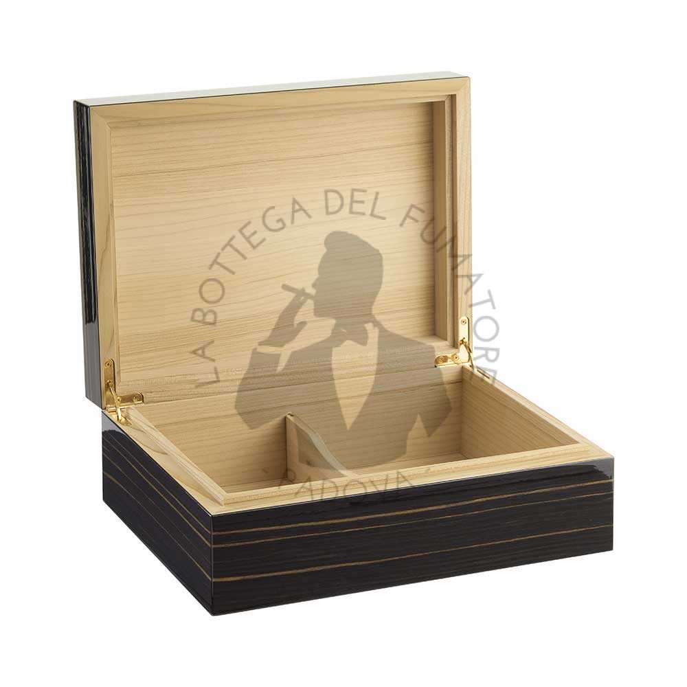 L’ Humidor Morici Roma Ebano Small (SC2), 100% MADE IN ITALY. È interamente costruito con legno di cedro. Realizzato con un affascinante combinazione di tecniche tradizionali di artigianato e gusto moderno, questa splendida scatola per sigari può arredare qualsiasi interno. La finitura esterna è anch’essa realizzato a mano, e arricchita con dettagli in metallo tinta oro. Può contenere fino a 30 sigari, e garantisce un efficiente isolamento ed una stabilità dell’umidità interna, senza precedenti.