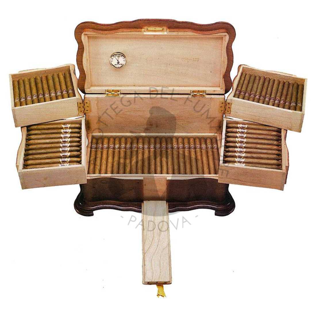 Una volta sbloccato la serratura, e sollevato il coperchio principale, quattro vassoi si aprono coma ali di una farfalla, permettendo cosi l’accesso al quindi comparto, situato alla base del mobile. all’interno di questi cinque compartimenti troviamo 155 sigari suddivisi in quattro vitolas differenti: 50 Salomon, 25 Robustos Extra, 24 Dalias, e per finire 56 109.