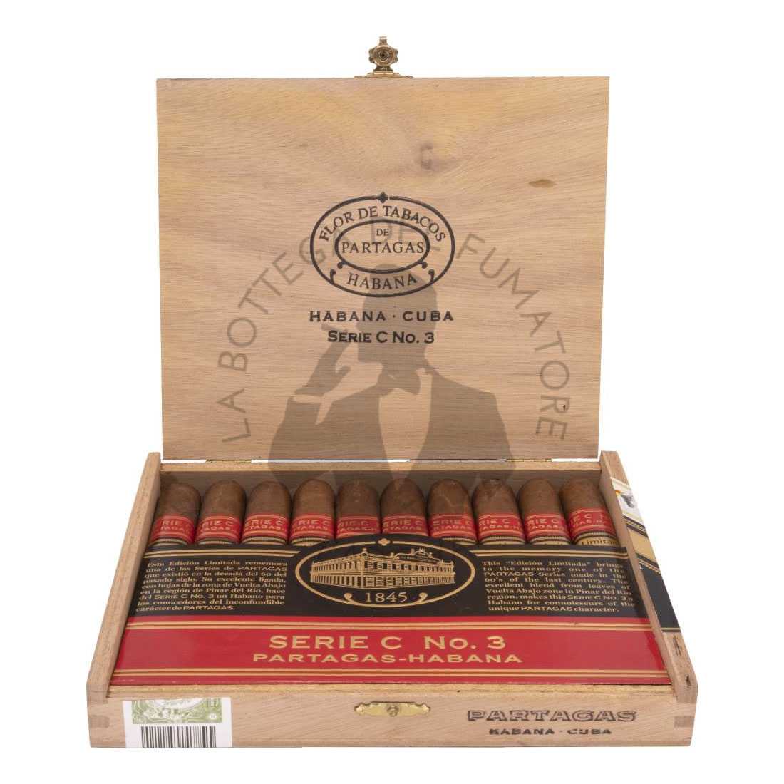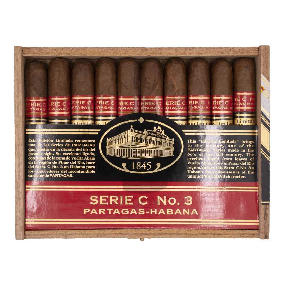 Il Partagas Serie C 3 2012 Edición Limitada assieme a H.Upmann Robustos e Montecristo 520, completa il trittico delle edizioni limitate di Habanos per l’anno 2012. Differentemente dalle altre due produzioni, questo Partagás Serie C No.3 presenta un’innovazione nel design. Un foglio di carta litografato che ricopre parzialmente i sigari contenuti. Confezionati in box Semi boîte nature da 10 unità. Sempre in questa edizione ha fatto la sua comparsa un etichetta adesiva di colore rosso e nera, posizionata lateralmente alla scatola.