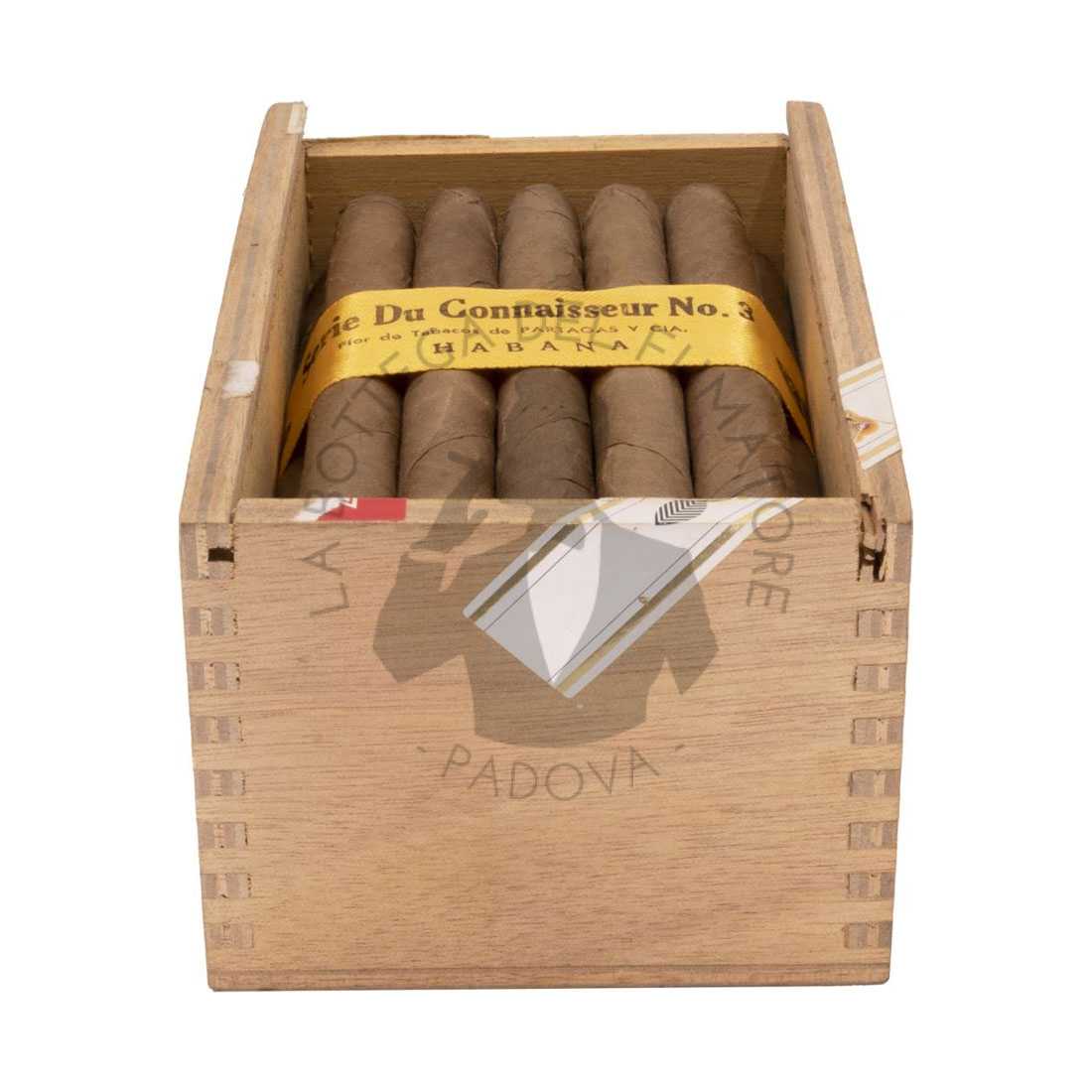 Il Partagás Serie du Connaisseur No.3 è un sigaro raffinato e ormai fuori produzione, che rappresenta una gemma della tradizione cubana. Realizzato a mano nel formato Carlotas, misura 143 mm di lunghezza per un ring gauge di 35, offrendo un’eleganza sottile e allungata che richiama lo stile dei sigari più classici. Fu introdotto prima del 1960 e rimase in produzione fino al 2010, chiudendo così un capitolo importante della storia della marca. In origine privo di anilla, dal 2005 adottò la banda standard Partagás, mantenendo comunque il suo carattere discreto e distinto. Veniva confezionato in eleganti scatole da 25 unità con coperchio scorrevole, un dettaglio che sottolineava il suo posizionamento come sigaro da intenditori.
