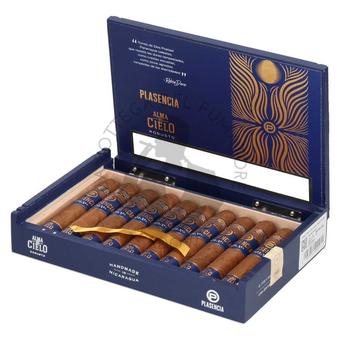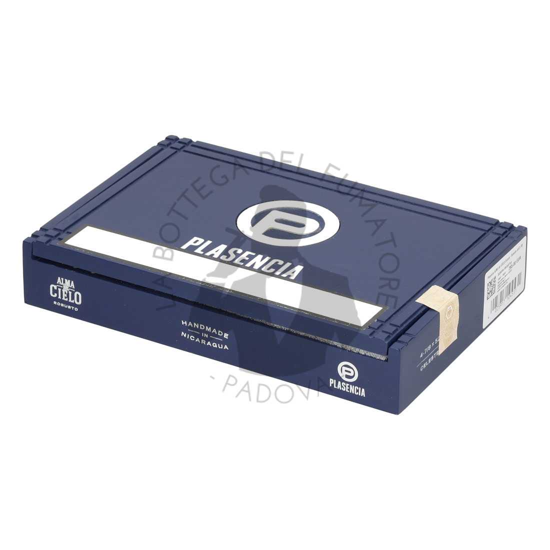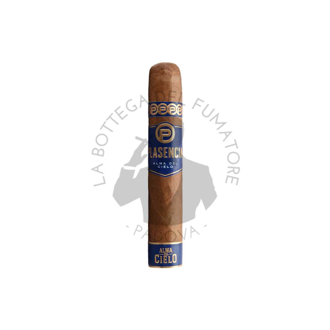 Il Plasencia Alma del Cielo Celeste è il sigaro dal formato piu contenuto dell’intera linea, pensato per il fumatore che predilige l’immediatezza della vitola Robusto (124 mm di lunghezza × 52″ di cepo). Dimensioni compatte che favoriscono una partenza piena e un’evoluzione rapida ma ordinata. Confezionato in raffinate scatole da 10 sigari, con il consueto impianto estetico sobrio e curato della linea. Il formato corto-ma-grosso, esalta la concentrazione aromatica e rende la fumata agile senza rinunciare alla presenza al palato.
