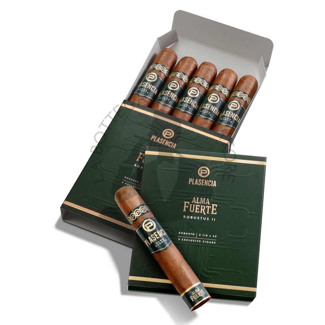 Il Plasencia Alma Fuerte Robustus II è un sigaro che, pur mantenendo dimensioni compatte, si distingue per eleganza e sostanza. Misura 130 mm di lunghezza con un cepo 55″ (una sorta di robusto gordo). Collocandosi come una via di mezzo tra il piccolo Robustus Corto e i formati più imponenti della linea. Realizzato interamente con tabacchi nicaraguensi invecchiati e selezionati, incarna la filosofia di eccellenza della famiglia Plasencia. Il confezionamento avviene in raffinati cofanetti in legno da 10 unità, caratterizzati dalla classica estetica Alma Fuerte, con la fascetta color verde scuro, che richiama il carattere deciso del blend.