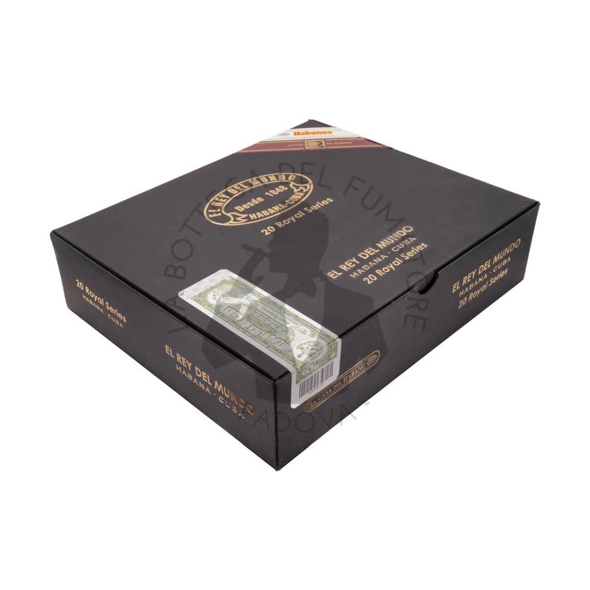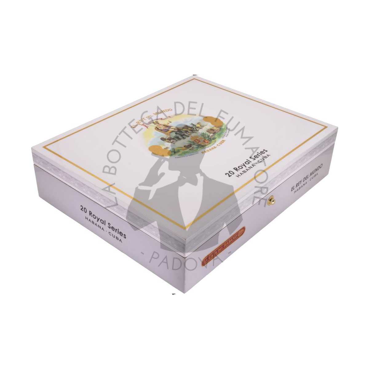 La confezione scelta da Habanos S.A. per la Royal Series è un’elegante scatola in legno laccato bianco lucido, decorata con dettagli avorio, colori che richiamano la regalità e il prestigio. Sulla parte superiore spicca il logo “El Rey del Mundo”, accompagnato dalla dicitura “20 Royal Series”. Il design è sobrio ma raffinato, con uno stile contemporaneo che strizza l’occhio alla tradizione cubana.