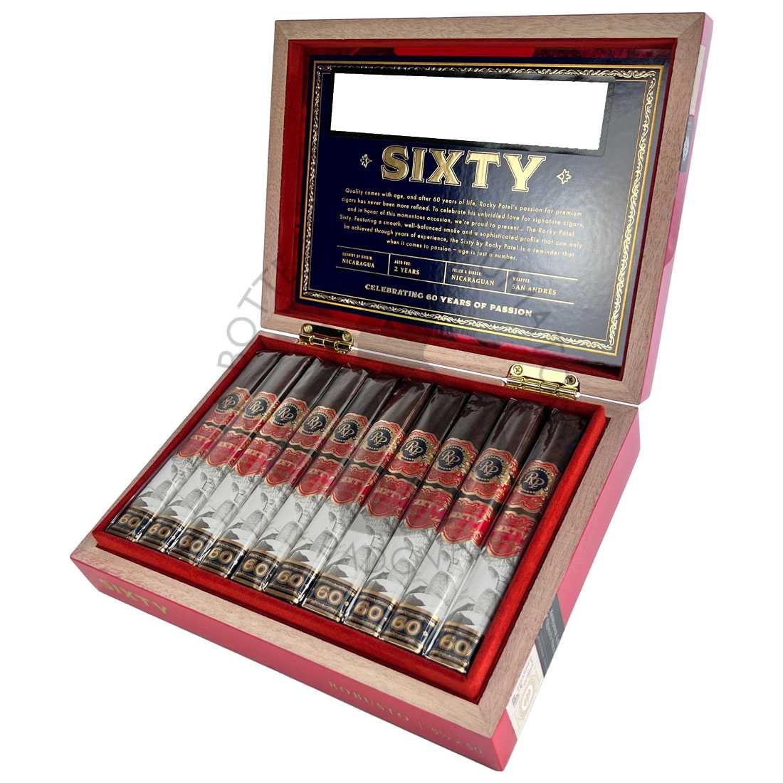 Lasciati conquistare dall’eccezionale maestria artigianale del Rocky Patel Sixty Sixty, un meraviglioso sigaro di medio corpo meticolosamente realizzato per onorare il 60° compleanno di Mr. Rocky Patel. Avvolto in una lucente capa messicana San Andres e capote nicaraguense, questa miscela mette in mostra l’arte dei tabacchi da ripieno nicaraguensi. In commemorazione di questa importante occasione, ogni sigaro viene sottoposto a un paziente processo di invecchiamento di non meno di 2 anni dopo essere stato arrotolato a mano presso la prestigiosa fabbrica Villa Cuba S.A. ad Estelí, Nicaragua. Il risultato è un sigaro di qualità superiore che incarna l’opulenza celebrativa.