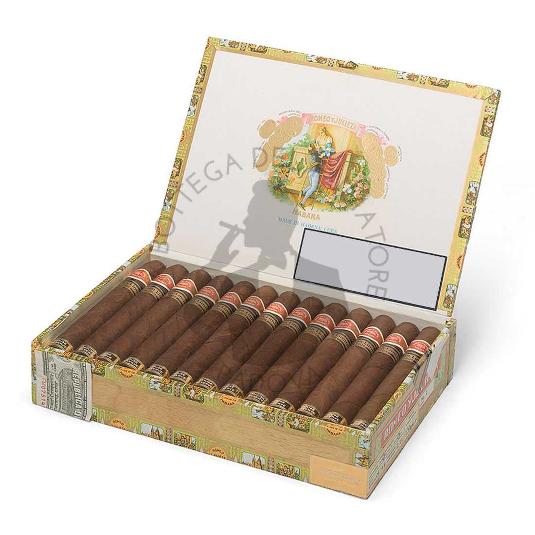L´equilibrata e aromatica ligada di selezionate foglie di tripa e capote provenienti da Vuelta Abajo, fanno dei Romeo y Julieta un classico da gusto medio. Oggi Romeo y Julieta gode di fama mondiale e offre la più ampia selezione di vitolas di Habanos, tutte elaborate “Totalmente a Mano, Tripa Larga” con foglie provenienti da Vuelta Abajo. (D.O.P)*