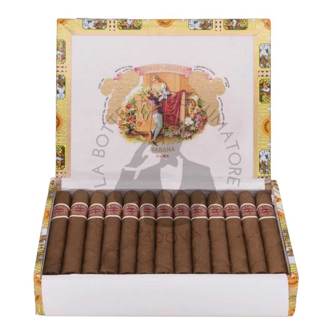 L´equilibrata e aromatica ligada di selezionate foglie di tripa e capote provenienti da Vuelta Abajo, fanno dei Romeo y Julieta un classico da gusto medio. Oggi Romeo y Julieta gode di fama mondiale e offre la più ampia selezione di vitolas di Habanos, tutte elaborate “Totalmente a Mano, Tripa Larga” con foglie provenienti da Vuelta Abajo. (D.O.P)*