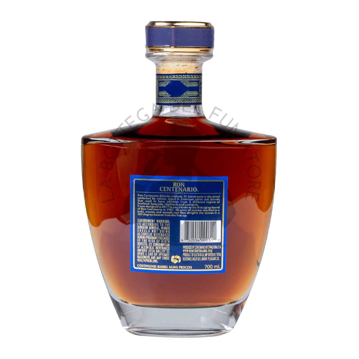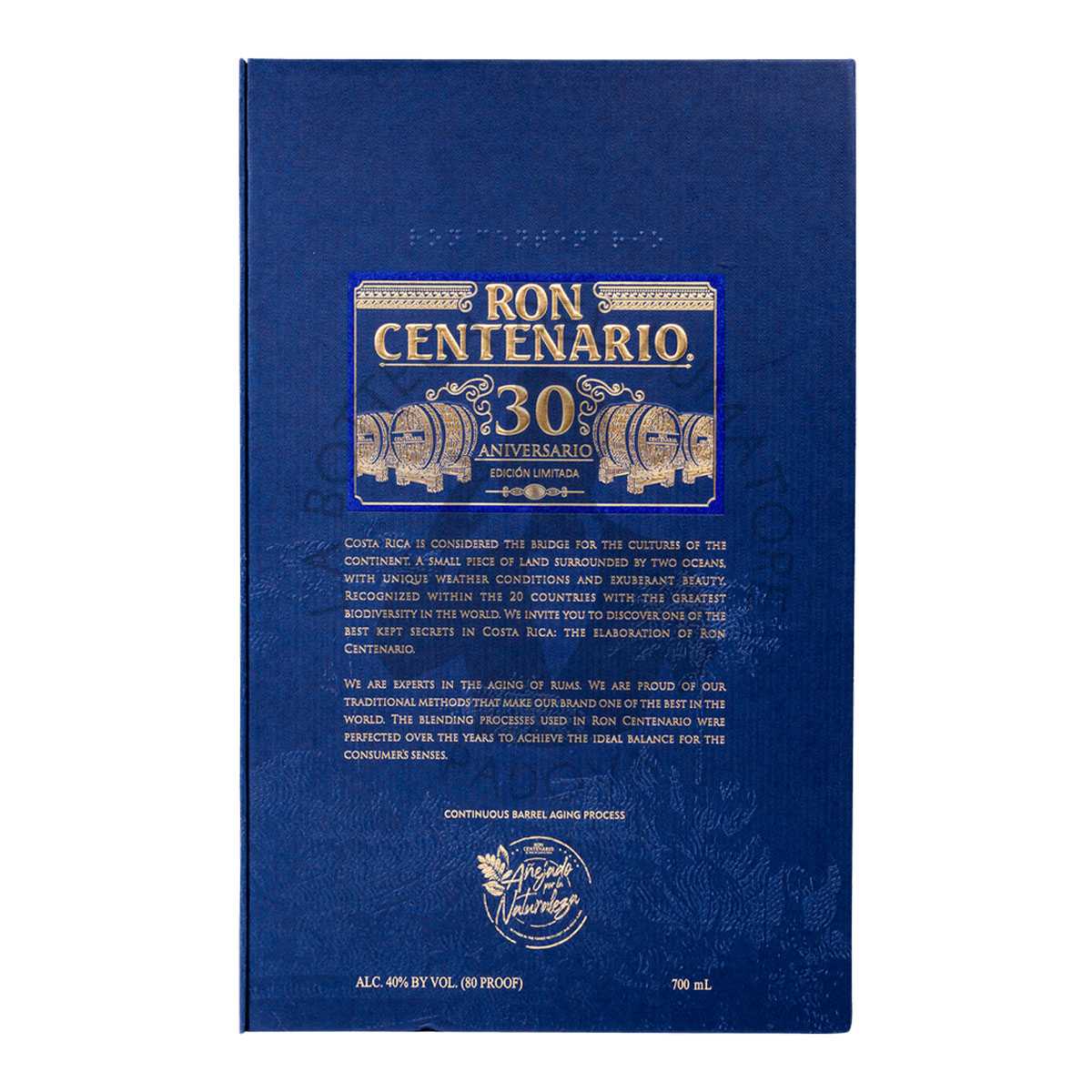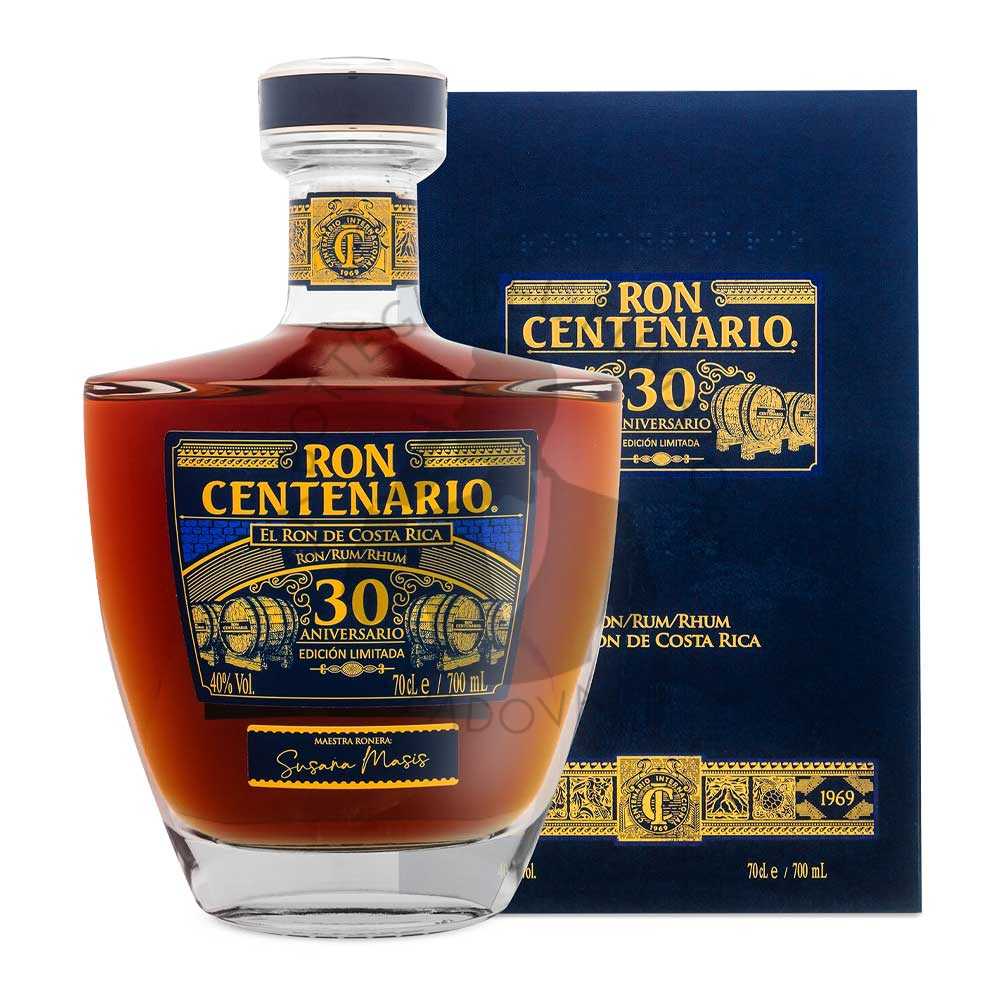 Ron Centenario 30 ° anniversario è un rum in produzione contingentata, quindi abbastanza raro e non sempre disponibile. Sviluppato nel 2011 per commemorare il 30° anniversario della fondazione dell’azienda, questo meraviglioso spirito, invecchia in botti di rovere bianco americano che contenevano Scotch Whisky. La miscela prevede una combinazione di diverse distillazioni di rum maturate singolarmente dagli 8 ai 30 anni. L’invecchiamento lento e naturale, perfezionato dalla natura, rende Ron Centenario 30 Aniversario è un rum audace, cremoso e molto setoso. Con grande bouquet e lunga permanenza in bocca mette in evidenza frutti rossi, quercia e cioccolato fondente.