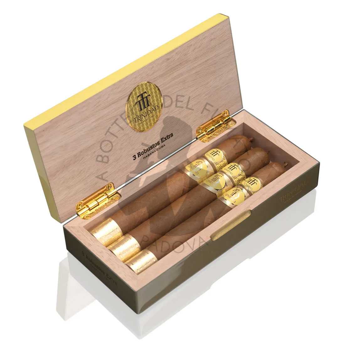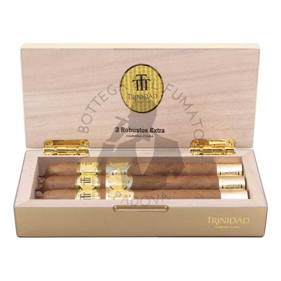 Questa nuova edizione del Trinidad Robustos Extra mantiene la medesima vitola de galera del suo predecessore (pre 2012): Dobles, misure 50″ di cepo per 155 mm di lunghezza. Ovviamente l’anilla è stata aggiornata e, in questa versione celebrativa del 55° anniversario, accompagnata da altre due: una secondaria, riportante il logo dell’anniversario, ed una al piede. Il confezionamento è passato dal Semi boîte nature box al Luxury boîte nature box, il conteggio rimane da 12 sigari. Anche se nel caso di questa presentazione, si tratta di un cofanetto regalo da tre sigari, una sorta di bomboniera di lusso, per regali altrettanto lussuosi.