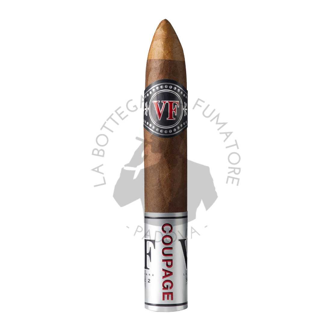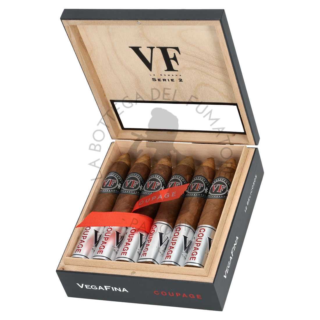 Questa edizione limitata in formato Belicosos e di medie dimensioni (cepo 52″ x 140 mm di lunghezza), ha una finitura molto speciale, un contrasto di tonalità nella fascia: chiara all’inizio del sigaro e scura nel corpo, mescolando foglie della Repubblica Dominicana e dell’Ecuador, offrendo una combinazione unica di aroma e sapore. VegaFina Serie 2 Coupage è disponibile in una scatola originale da 12 sigari con il nuovo logo VF del marchio. I sigari, che hanno un anilla al piede che si abbina al design della scatola, presentano anche il nuovo logo VF sull’anilla principale.
