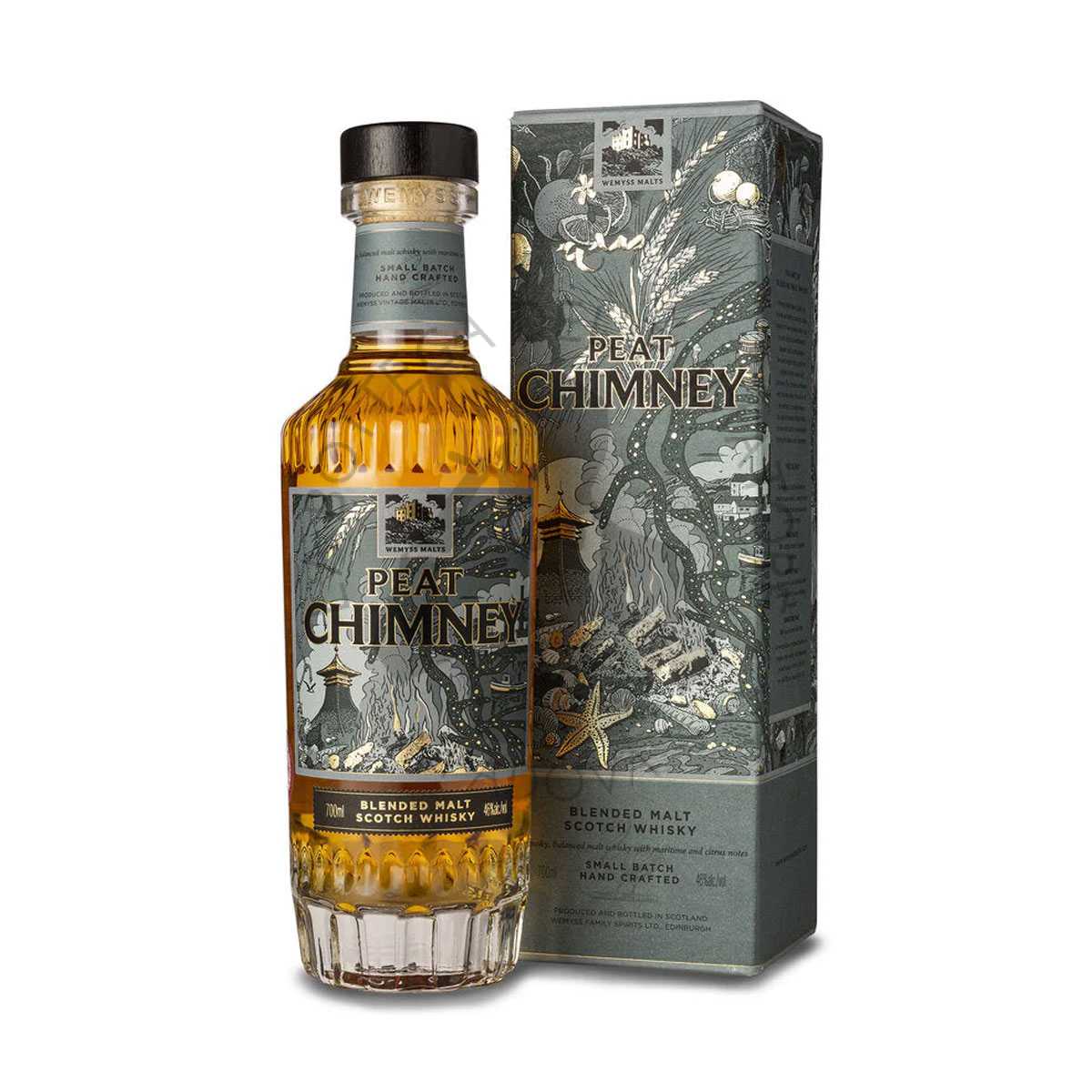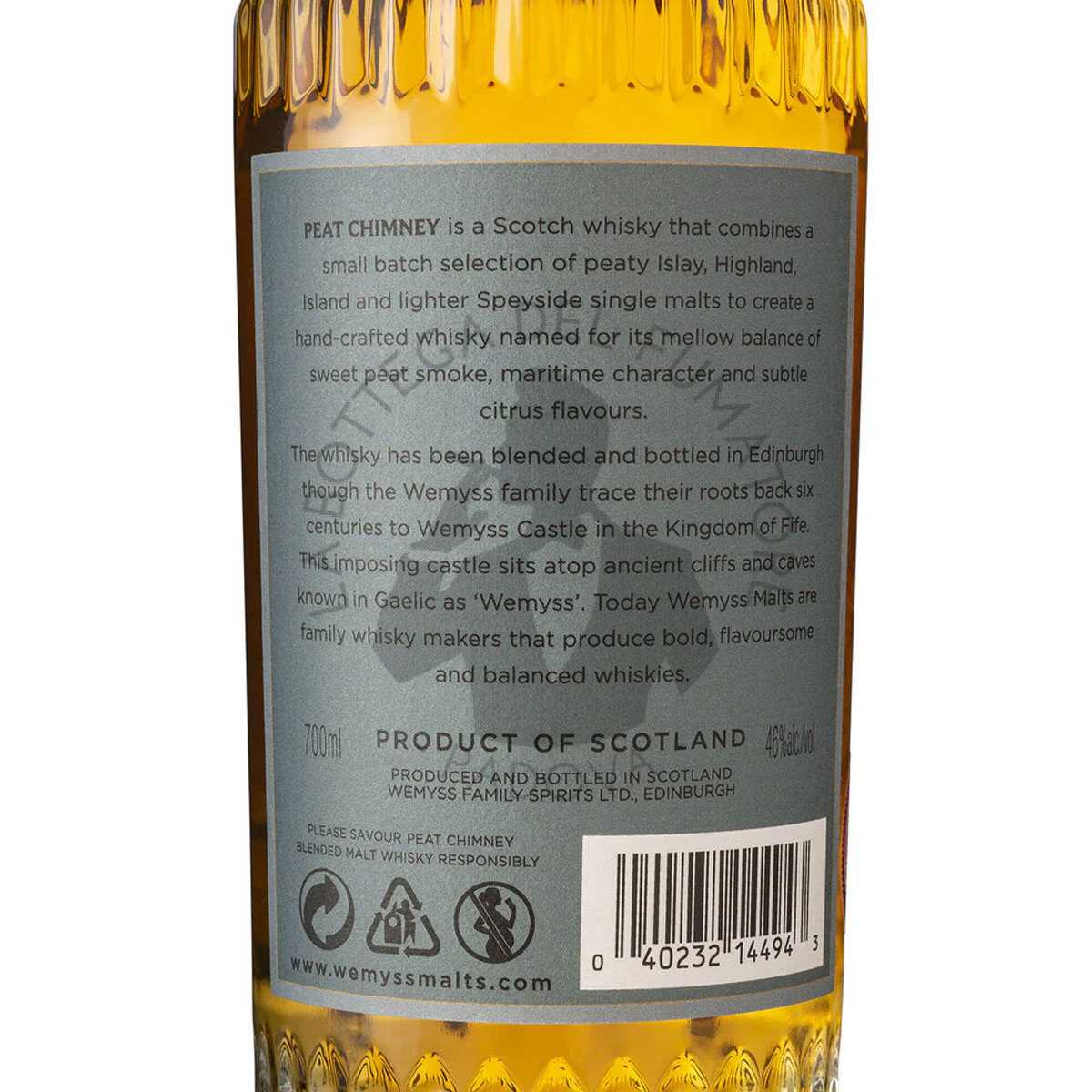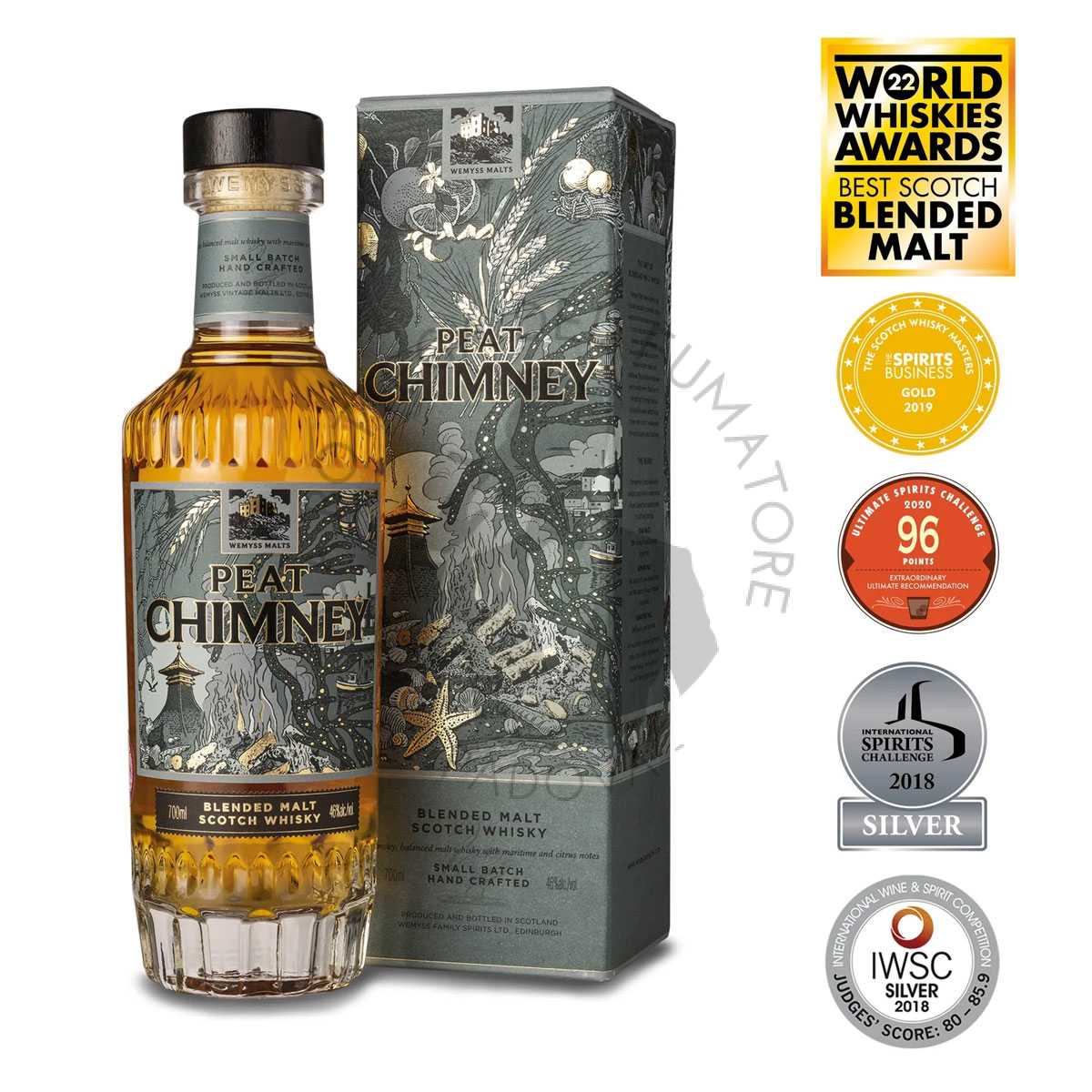 Il Whisky Wemyss Peat Chimney è un puro whisky scozzese, realizzato in piccoli lotti sulle sponde del fiume Spey, in Scozia. Prodotto a mano rispettando antiche tecniche artigianali, cattura il fascino dei malti torbati e affumicati in un’espressione equilibrata ricca di note marittime e agrumate. Aromi di erica si avvolgono alla frutta a nocciolo e scorza d’arancia. Al palato, caldi sbuffi di torba su un ricco aroma di caffè espresso e zucchero filato. Nel finale, la mineralità di selce si sfrigola morbido e dolce, lasciando una piacevole sensazione di pulizia in bocca.