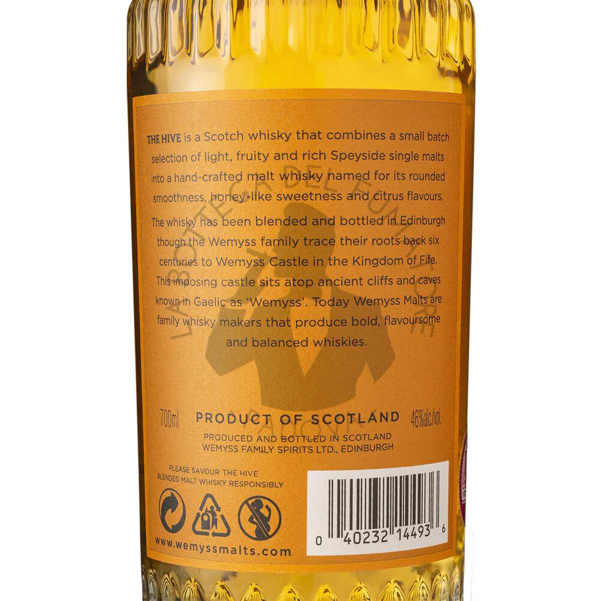 Whisky Wemyss The Hive è prodotti in piccoli lotti per volta, È un whisky scozzese fatto a mano che cattura la dolcezza di Speyside in un’espressione morbida e simile al miele. Al naso è un vero e proprio bouquet di fiori, e miele di fiori di campo. Al palato le note agrumate dell’arancia si mischiano alla perfezione con quelle piccanti dello zenzero. Si conclude in un calore piccante, al pompelmo e chiodi di garofano.