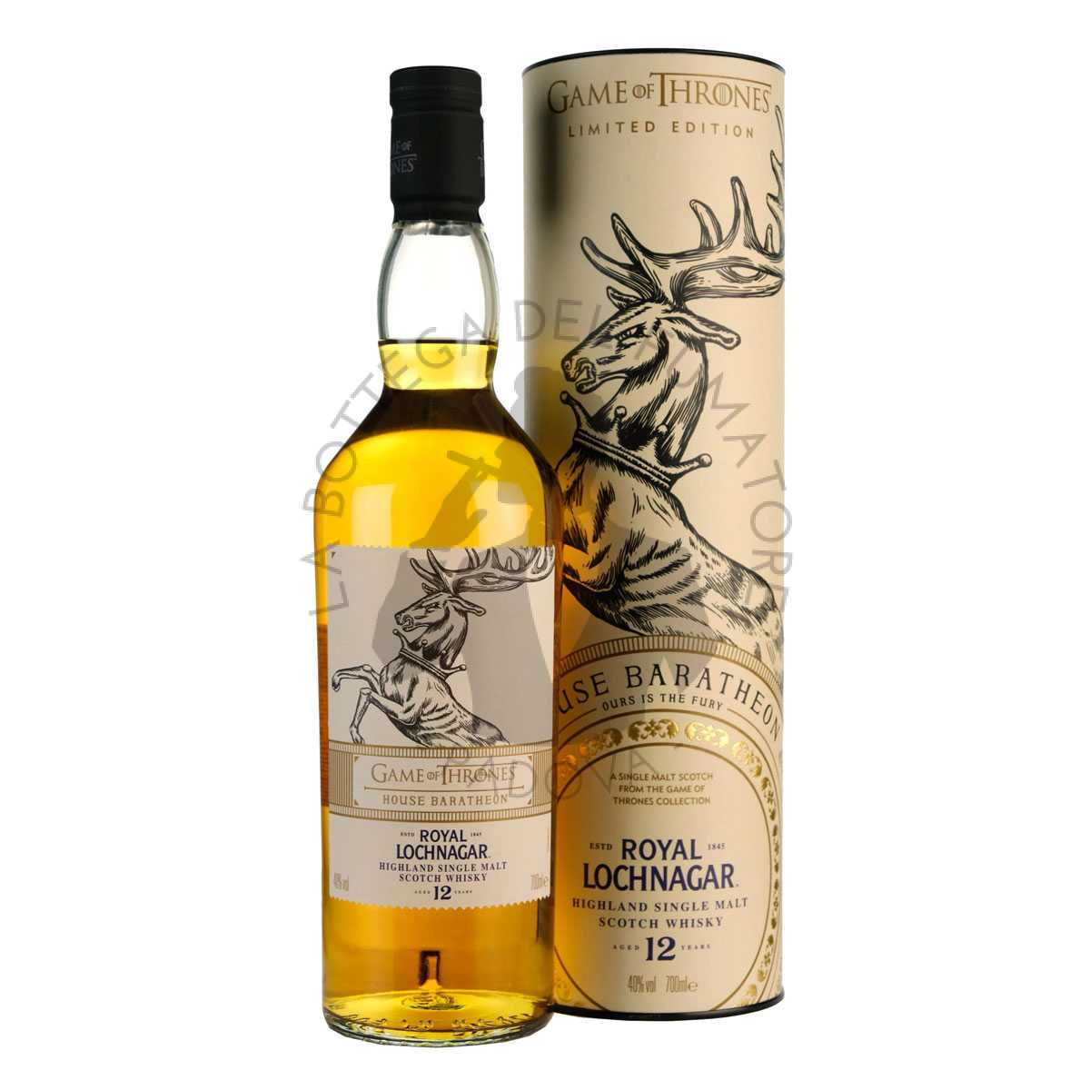 Il Royal Lochnagar 12 Years Old (House Baratheon) è uno dei single malt Scotch whisky più esclusivi della serie. Questo whisky è stato invecchiato per almeno 12 anni in botti ex-bourbon ed ex-sherry prima di essere imbottigliato al 40% vol.