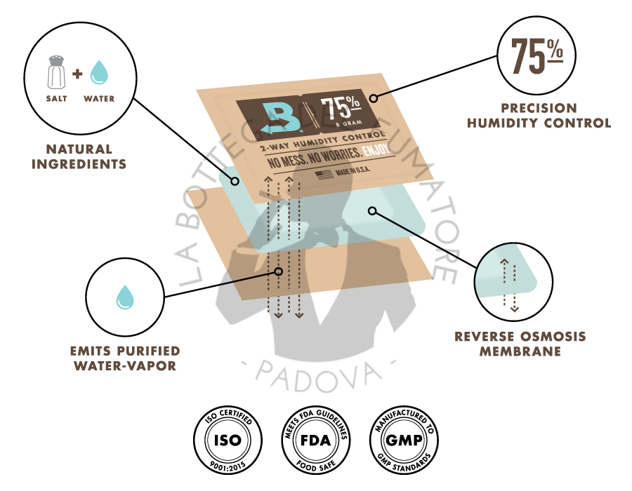 Boveda Inc. è un azienda specializzata nella realizzazione di soluzioni per la conservazione e ottimizzazione di prodotti sensibili all’umidità. Non tutti i sistemi di umidificazione sono uguali. Solo Boveda infatti utilizza una soluzione salina brevettata, completamente naturale per proteggere e conservare, con precisione, tabacchi, sigari, cannabis, strumenti musicali e cibo.